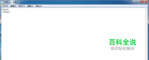 打开文本文档,开始编辑html源码,html标签语言有开始标签和结束标签,中间为标签的内容,首先我们输入头和尾