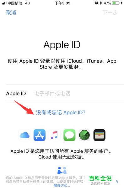 之后如果您有Apple ID账号的话,输入一下账号与密码登录即可设置,没有的话点击下方“没有或者忘记Apple ID”,也就是注册选项,进入Apple ID创建页面,如下图所示: