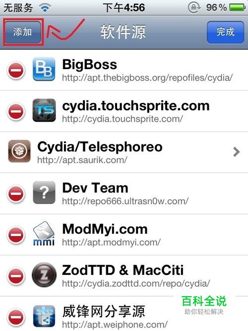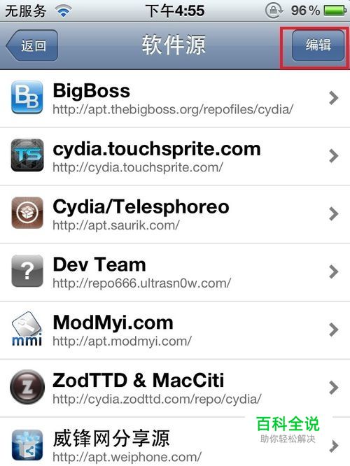 打开你的cydia,点击【管理】,找到【软件源】,点击进入。 点击【编辑】如图: