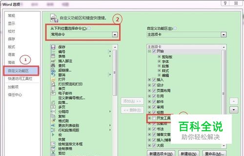 单击选择“自定义功能区”,选择“常用命令”,在自定义功能区下方找到“开发工具”,并勾选前面的方框,完成后单击“确定”按钮。 之后,word的标题栏将出现“开发工具”选项。