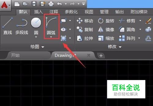 打开CAD之后我们在工具区里找到圆弧命令,如图所示: