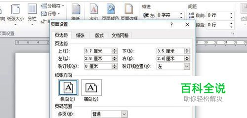 点击“自定义页边距”后,则会弹出页边距的设置窗口,将页边距下方的上、下、左、右参数值分别设置为3.7、3.5、2.8和2.6,这几个参数就是公文标准要求的参数值。设置好之后点击窗口下方的【确定】即可完成设置。
