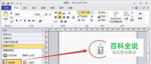 从左侧的“形状”窗格中将需要在网络拓扑图中表现的设备图形拖到绘图区,如将“网络和外设”分类中的“服务器”图形拖到绘图区。