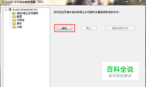 首先启动arcgis的服务器,在程序-arcgis-lincense manager中打开 license server anministrator,并且点击启动。