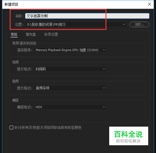 打开PR视频剪辑软件,单击选择新建项目,在出现的新建项目设置窗口中,先改一下项目名称,我们就命名为“文字遮罩效果”,然后选择一个项目保存位置,其他的相应设置可以保持默认,也可以自行进行更改。