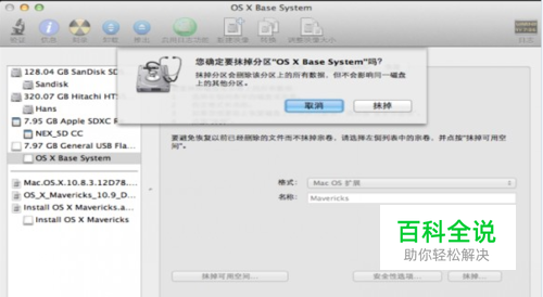 3,打开磁盘工具选择U盘,选择“抹掉”标签格式为“Mac OS扩展”格式,名称输入“Mavericks”(一定记住是这个名字,后面的命令需要用到)