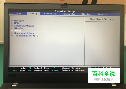 首先在开机的时候按F1或者Fn+F1进入BIOS,关闭内置电池供电。选择顶部菜单至 Config选项内的 Power选项。