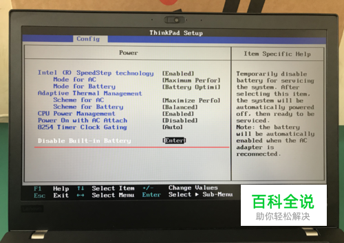 在Power选项内选择最后一项,禁用内置电池。(装好再次开机需要插电或者插上外置电磁才能开机)