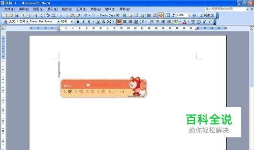 打开Word 2003,输入法调到中文状态,输入拼音”gou“,在弹出的选项中即可看到钩,如图所示。