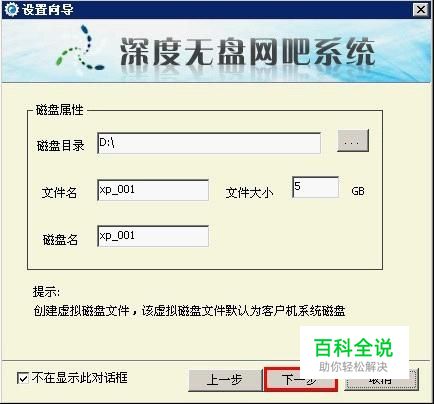 勾选不在显示此对话框,然后单击下一步创建虚拟磁盘,如图