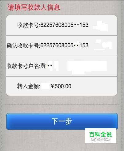 填写收款人的信息,包括:收款卡号、确认收款卡号、收款卡户名、转入金额;