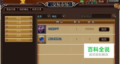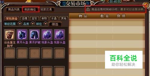 点击“我的摊位”可以进行道具的出售,商品出售的时间最多为48小时,每个玩家最多可以同时出售16个道具,需要注意的是“绑定”的道具是不能上交易市场的。