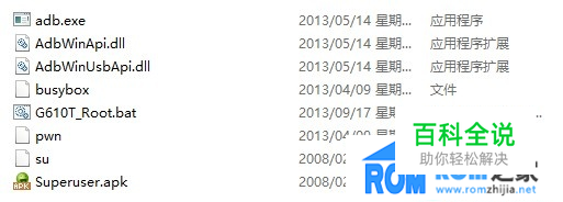 华为G610T如何获取ROOT权限?rom之家小编今天带来华为G610T手动获取ROOT权限图文教程,希望能帮到各位! 准备工作 1、手持华为G610T手机; 2、建议手机电量 30% 以上; 3、Root工具包:G610T_Root --------------------------------------------------------------------------------- Root流程 1、下载工具包后解压如下 2、点击G610T_Root.bat,等待一会儿即可完成Root
