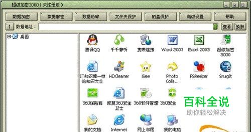 运行软件 双击桌面上的图标 或者点击“开始→程序→超级加密3000→超级加密3000”即可运行该软件。进入软件主界面。 超级加密3000的界面有点类似于资源管理器的界面,看上去非常简洁,功能按钮在上方一目了然。左侧的目录树空格及右侧的目录内容空格使得文件的选择非常方便。