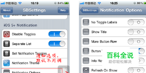5.以上设置完成后,按home退出,手机会自动注销,然后等注销完,进设置-通知-不在通知中心-找到SBSettings-打开即可