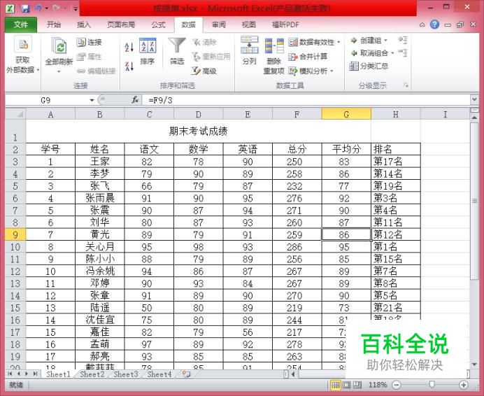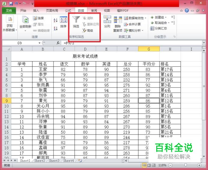 我们以条件“总分大于265或小于等于250为例” 单击“总分”下的三角,然后在菜单中,选择“数字筛选”中的“自定义筛选”