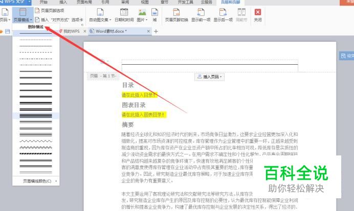 下拉页眉横线就会出现很多选项,如果是消除横线就点击“删除横线”,如果想要加入横线就选择横线的样式就可以加上了!具体如下图所示