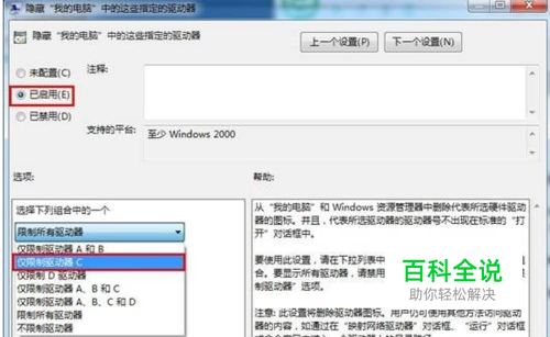在属性设置窗口中,我们只需点击“已启用“,并在驱动器下拉列表中选择需要隐藏的磁盘,点击”应用—确定“按钮保存修改即可。