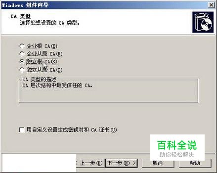 在打开的“CA类型”对话框中选中“独立根(CA)”单选框,单击“下一步”按钮,如图所示。