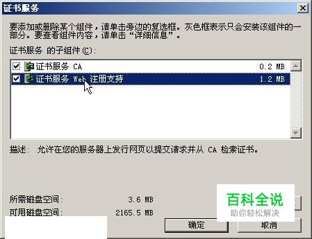 在“组件”列表中找到并选中“证书服务”选项,然后单击“详细信息”按钮,在打开的“证书服务”对话框中选中“证书服务Web注册支持”和“证书服务颁发机构(CA)”复选框。依次单击“确定”→“下一步”按钮,如图所示。
