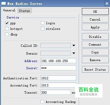 ROS端配置方法: 1.使用ROS的WINBOX,配置ROS的内外网IP地址(此项如不会,请自行参考网络上其他文档) 2.配置RADIUS服务:如下图所示