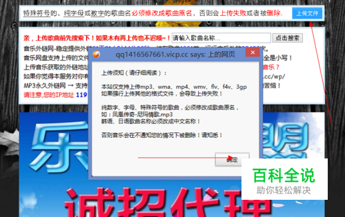 第二步: 点击“上传文件” 请仔细阅读上传说明后,点击确定,再次点击“上传文件”选择本地电脑要上传的歌曲。稍等1-5分钟,这个时间要看你的网速快慢!速度不定!