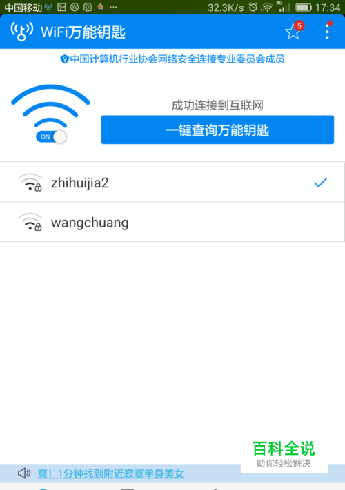 先用你的手机安装一个万能钥匙,在有WiFi的地方连上WiFi。如图: