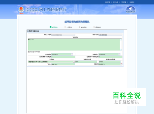 第一步:填写表单,标*的项目为必填项目。 1. 输入申请理由,字数不超过3000字。 2. 下拉日历列表选择申请期限起、申请期限止,申请期限不得早于申请日期。 3. 下拉列表带出纳税人已核定的发票种类,选择申请超限量领购发票的种类;填写申请特批发票数量;“每月最高购票数量”根据纳税人选择的发票种类自动带出。 4. 如纳税人申请的票种为定额发票,则“申请特批数量”、“每月最高购票数量”不可填写,“定额发票申请特批金额”必填。 5. 填写完毕,点击[保存]按钮,保存本次已填写的内容。点击[下一步]按钮提交当前数据并继续办理如仅保存未提交,则下次进入该表单时前次保存内容可选择回显自动带出,无需再次输入。