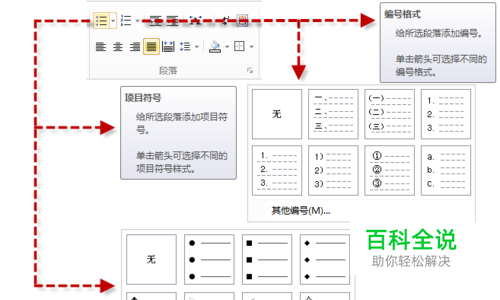 ③点击【项目符号】、【项目编号】的下拉按钮即有更多选择。
