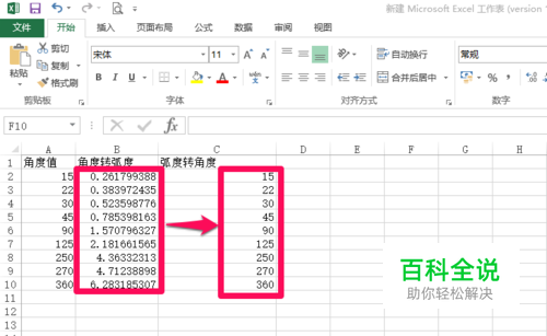 计算弧度转角度,弧度转角度的计算公式为:角度值=弧度值*360/2/pi。故输入公式:=B2*360/2/PI()。输入公式后,点击回车键,即可转换为角度值。
