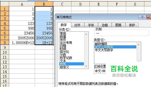 为了做对比,我们在B列复制了一列。选中B列的区域,点右键,选择设置单元格格式,在数字标签里面往下找到“特殊”类别,然后右侧选择“中文小写数字”,点确定。