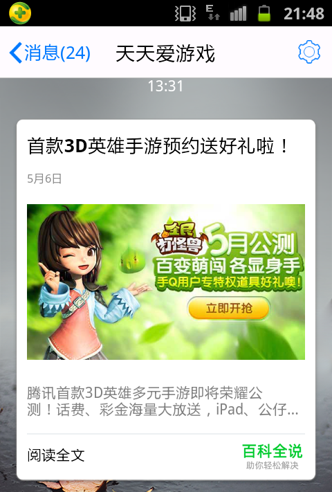 点击天天爱游戏,进入到天天爱游戏的对话信息中。在里面有很多系统发来的信息,我一个都没看。点击右上角设置的标志。
