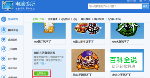如图所示,我们点击箭头所指的“立即修复”按钮,对“御龙在天登录失败”这个故障进行修复。