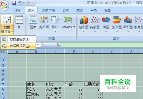 点击插入菜单栏最左面的数据透视表,会出现两个选项卡:数据透视表和数据透视图,这里我们演示的数据透视表,再点击数据透视表