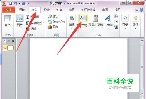 首先,打开PPT2010,点击插入选项卡,点击文本功能区中的文本框按钮。