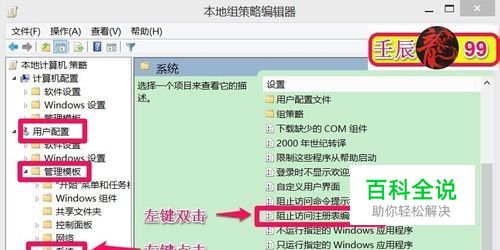 在打开的本地组策略编辑器窗口,我们展开:用户配置 - 管理模版,找到:系统,并左键点击:系统,在系统对应的右侧窗口,找到:阻止访问注册表编辑工具,并左键双击:阻止访问注册表编辑工具;