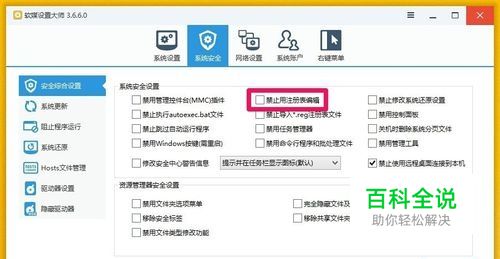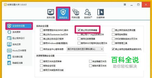 在软媒设置大师窗口,我们点击:系统安全,在安全综合设置标签右侧窗口,我们可见:系统安全设置项中的 禁止注册表编辑的复选框打了勾,也就是说禁止了使用注册表编辑器;