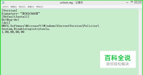 方法三:创建一个注册表解锁的文件。 把下列内容复制到记事本: [Version] Signature=“$CHICAGO$” [DefaultInstall] DelReg=del [del] HKCU,Software\Microsoft\Windows\CurrentVersion\Policies\ System,Disableregistrytools, 1,00,00,00,00