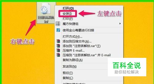 这时桌面上就会显示一个注册表解锁.inf的文件图标,我们右键点击:注册表解锁.inf图标,在右键菜单中左键点击:安装,安装完成后,我们便可以打开注册表编辑器了。