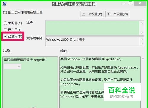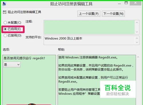 在打开阻止访问注册表编辑工具窗口,我们可见:阻止访问注册表编辑工具的状态为:已启用(E),这就是打不开注册表编辑器的原因之一;