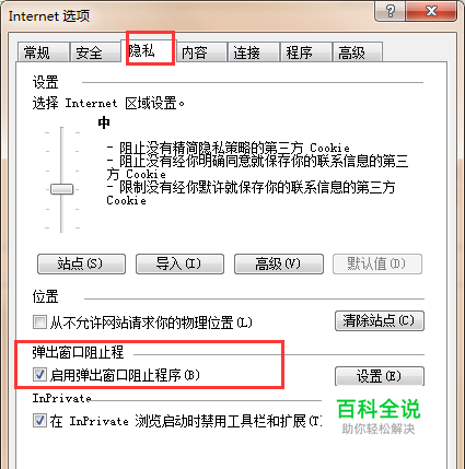 Inernet选项弹出框,点击“隐私”,勾选“启用弹出窗口阻止程序”,点击“确定”
