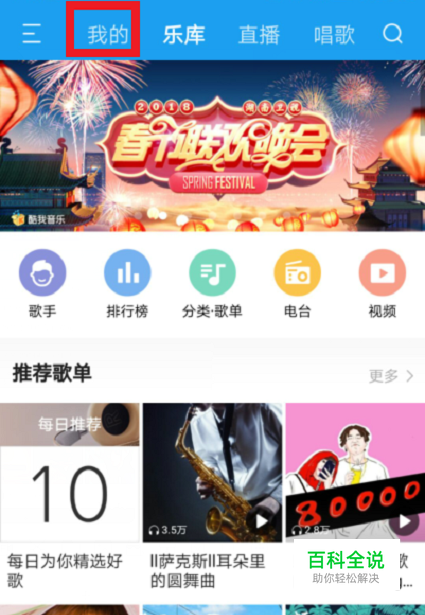 打开“酷我音乐”主界面,在上方的蓝框区域看见“我的”二字,手指进行点击。