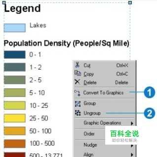 此时,你就可以对图例中的各个单项进行独立编辑了,假如你想要修改图例文字,由于默认状态下,图例文字和前面的图形符号是组合状态,所以还要选择某一图例项,取消组合状态。