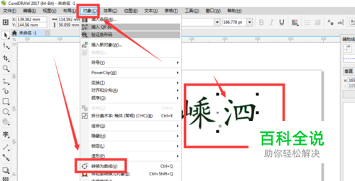 转曲也可以在选中文字后,右键调出属性栏,选择其中的转换为曲线,快捷键ctrl+Q;