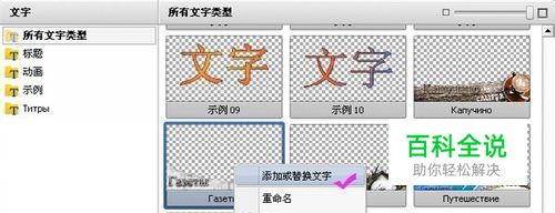 在“文字”功能上,你可以看到有很多添加“文字的类型”,有:标题、动画、示例等。你点击一个在右边的播放器上就可以预览观看。选好哪个之后,右键选择“添加或替换文字”按钮,“文字类型”就可以添加到下面的轨道上。