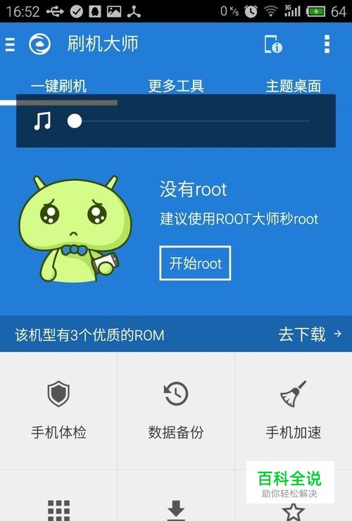 下载在手机找到的软件比如刷机大师,打开,可以看到没有root会提示,root,刷机包ROM,数据备份,跑分软件等都集成在里面,