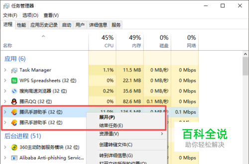 在进程里面找到腾讯手游助手相关的进程,右键结束任务