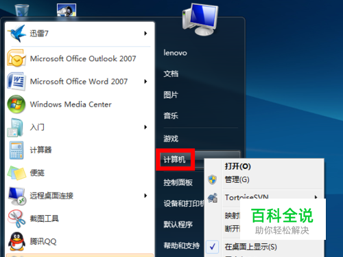 首先点击开始菜单按钮,把鼠标指向 “计算机”。然后点击鼠标右键,在弹出来的菜单中选择 “属性”,如图所示