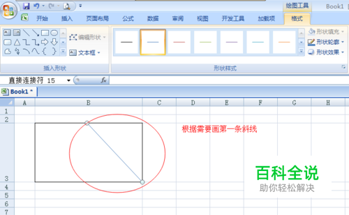 如图。在方框中利用斜线工具,根据需要画出第一条斜线。 注意:在画线的同时按住Alt键,可以定位单元格边角