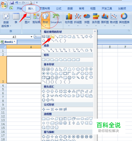 打开Excel表,点击“插入”并选择“形状”中的斜线。